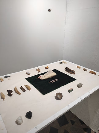 Mun työpöytä kotona on kuin mun oma huone (dumppaan siihen kaiken mille en juuri sillä hetkellä jaksa ettiä oikeeta paikkaa), täynnä mun hienoja aarteita, ystävällisiä kuvia, kiviä ja kukkia. Veistelen siinä ääressä erilaisilla materiaaleilla ja materiaalien vaihdon välissä pesen kaikki välineet. Tähän mennessä työskentely ei ole vaikuttanut olohuoneen yleiseen käytettävyyteen.